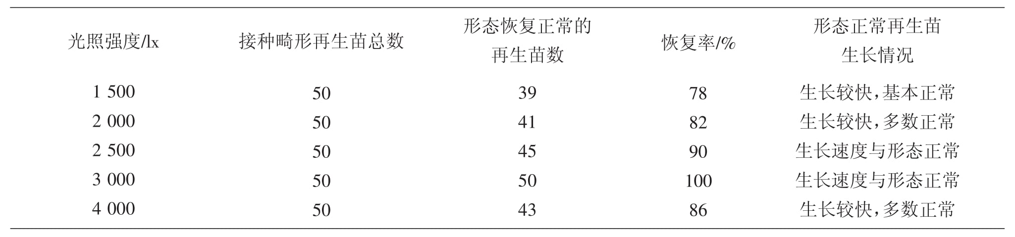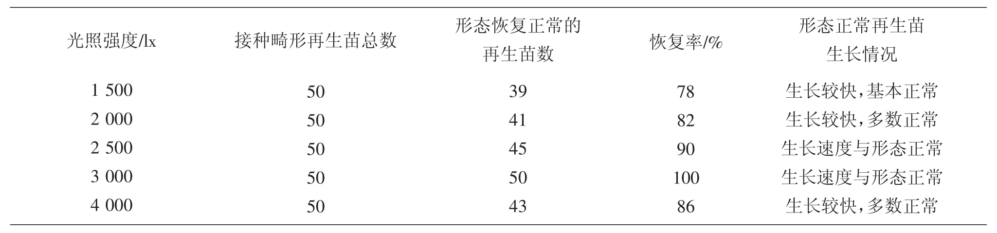 從表2可以看出,冰燈玉露形態正常率較高,原因主要是由於試驗采用的培養基為MS附加0.25 mg·L-1的BA,因此,香蕉视频污下载苗形態普遍變得較為正常;但在不同溫度下,形態正常苗的比例有所不同,當溫度為20℃時,獲得的形態正常的香蕉视频污下载苗數多,而隨著溫度的增加,香蕉视频污下载苗恢複率也逐漸下降,到28℃時,僅有38%。說明冰燈玉露形態建成培養的溫度應采用較低的溫度。在試驗中,也曾采用18℃進行培養,但結果顯示,幾乎所有香蕉视频污下载苗都停止生長,隻有個別生長正常,說明過低溫度也不利於冰燈玉露香蕉视频污下载苗的形態建成。雖然在20℃時可以獲得較高的冰燈玉露香蕉视频污下载苗的恢複率,但也因溫度較低,香蕉视频污下载苗生長速度較慢,也不是理想的培養條件。為此,試驗又采用不同光照強度來提高形態重建率,希望獲得較高、較快的冰燈玉露形態重建培養。