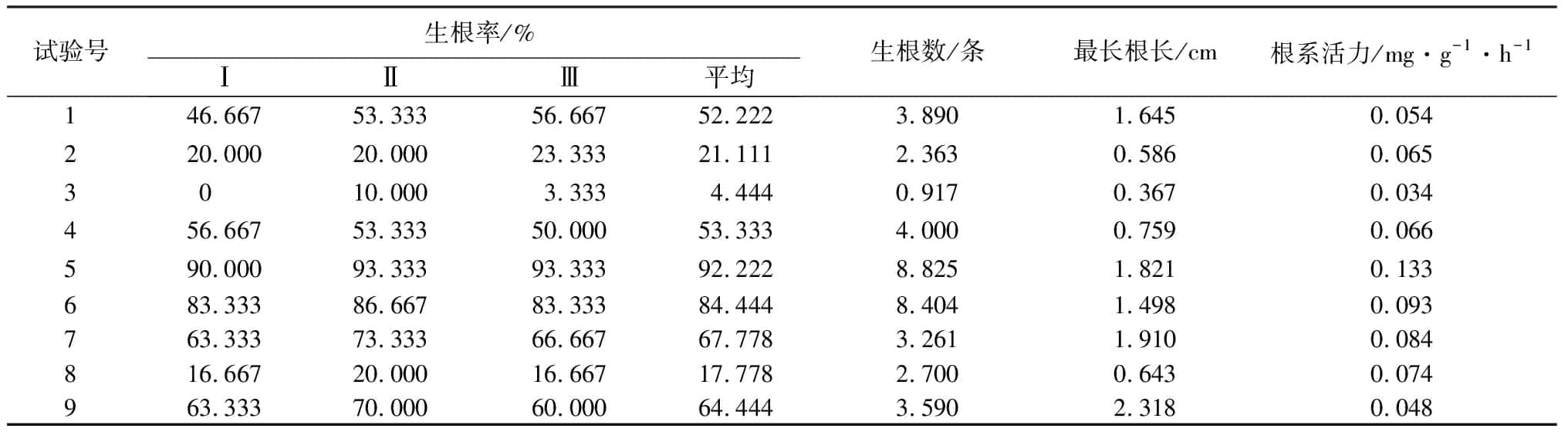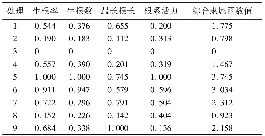 利用SPSS16.0軟件和Excel 2003對所測數據進行方差分析和多重比較,通過隸屬函數法對生根效果進行綜合評價。