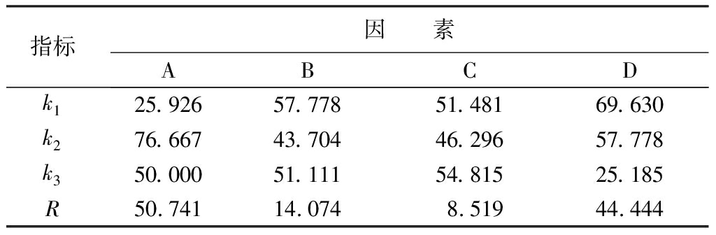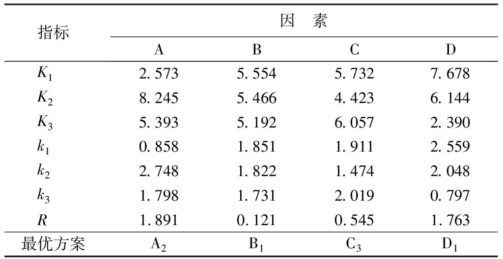 注:K為不同處理中各個因素對應的各個水平的數值之和;k為K的平均值;R為極差。