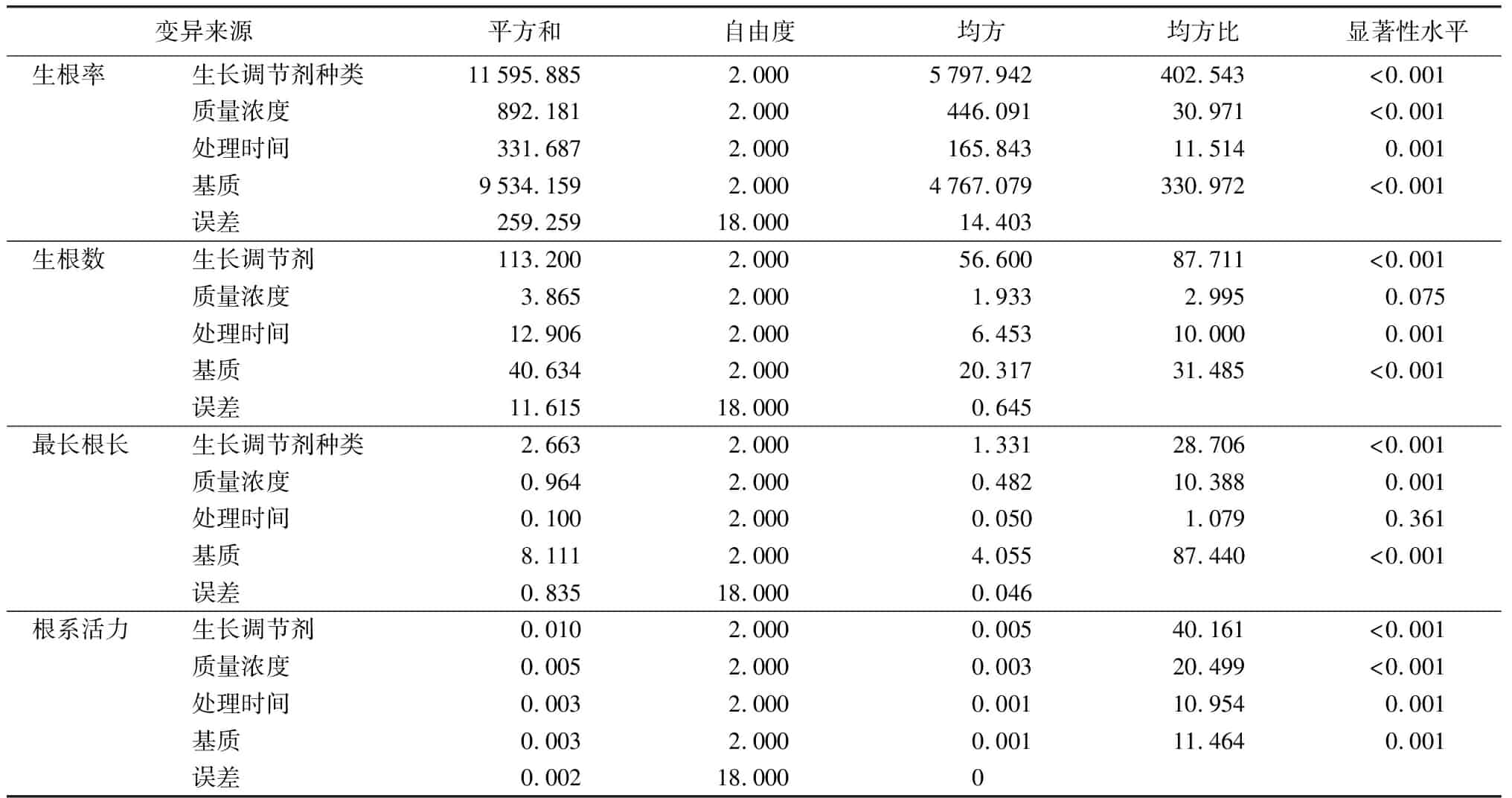 在根係活力方麵,各處理因素下香蕉视频污下载苗根係活力均方比由大到小順序為生長調節劑種類、質量濃度、基質、處理時間,4個因素對根係活力皆有顯著影響(P<0.05)(表4)。