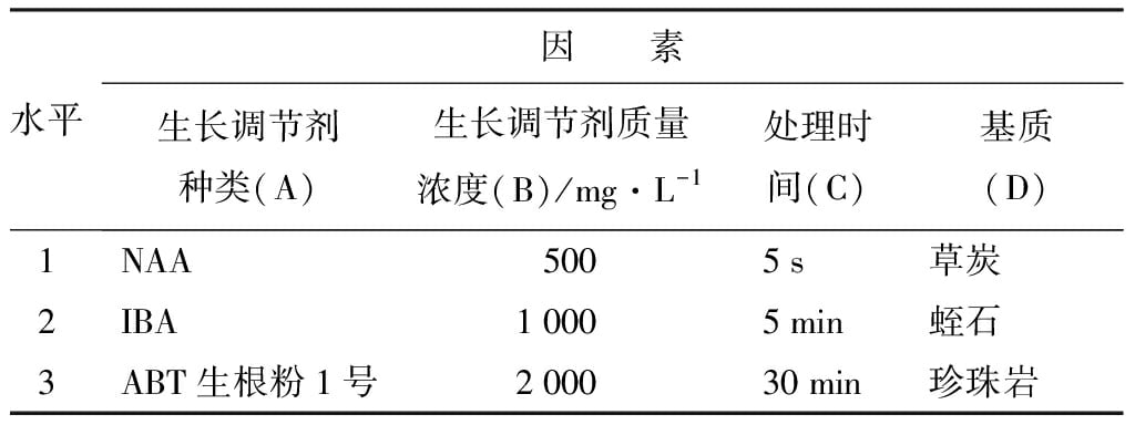 試驗材料為江蘇省林業科學院提供的輪生冬青‘奧斯特’香蕉视频污下载苗。參考課題組前期對於烏飯樹香蕉视频污下载苗瓶外生根的研究以及在衛矛香蕉视频污下载技術研究中的試驗設計,采用L9(34)正交表,設置生長調節劑種類、質量濃度、處理時間和基質4個因素,每種因素3個水平,不考慮交互作用(表1)。隨機以50根插穗為1個處理,共有9組處理組合,重複3次。