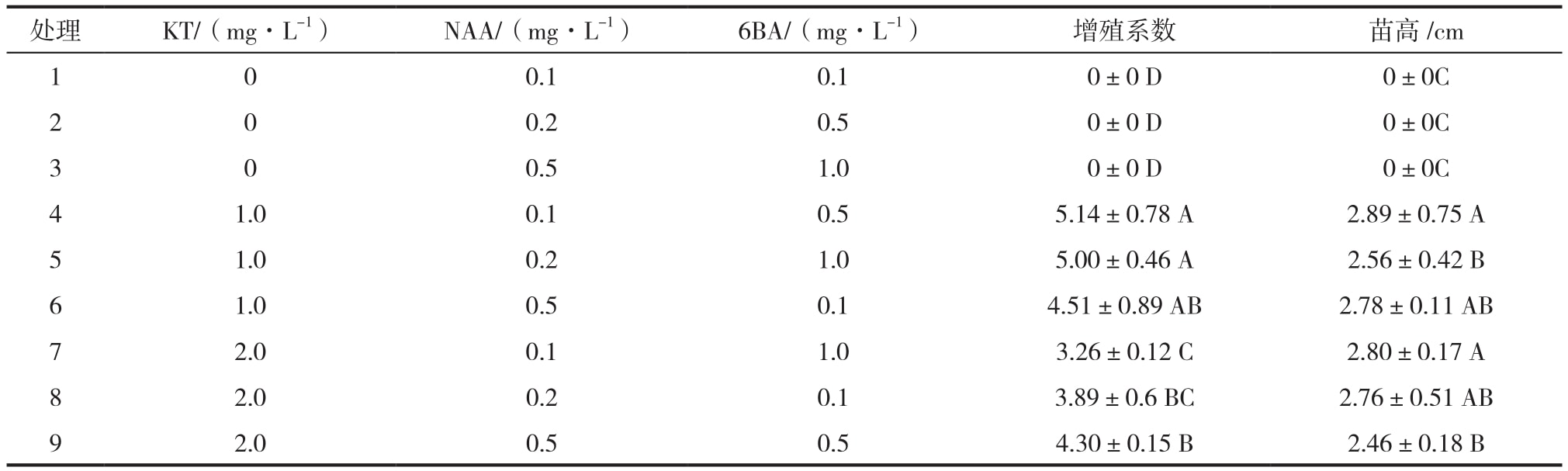 以MS為基本培養基,添加植物生長調節劑KT、NAA和6 BA,KT濃度設定為0、1.0、2.0 mg/L,NAA濃度設定為0.1、0.2、0.5 mg/L,6 BA濃度設定為0.1、0.5、1.0 mg/L。按照正交表 L9( 34) 設計成 9 種不同的處理。將誘導的芽單獨切離下來接種到培養基上,每個處理接種30個芽,分別接種在5個培養瓶中,每瓶接種6個芽,重複 3 次。30 d 後調查其增殖倍數和生長情況。