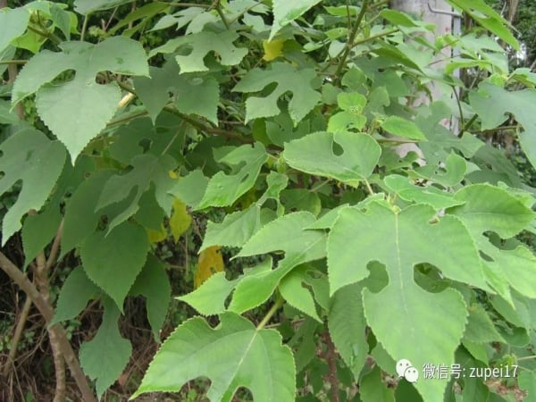 葉螺旋狀排列,廣卵形至長橢圓狀卵形,長6-18cm,寬5-9cm,先端漸尖,基部心形,兩側常不相等,邊緣具粗鋸齒,不分裂或3-5裂,小樹之葉常有明顯分裂,表麵粗糙,疏生糙毛,背麵密被絨毛,基生葉脈三出,側脈6-7對;葉柄長2.5-8cm,密被糙毛;托葉大,卵形,狹漸尖,長1.5-2cm,寬0.8-1cm。