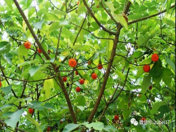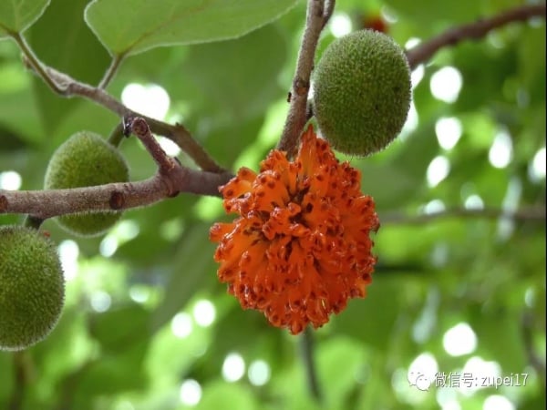 聚花果直徑1.5-3cm,成熟時橙紅色,肉質;瘦果具有等長的柄,表麵有小瘤,龍骨雙層,外果皮殼質。花期4-5月,果期6-7月。
