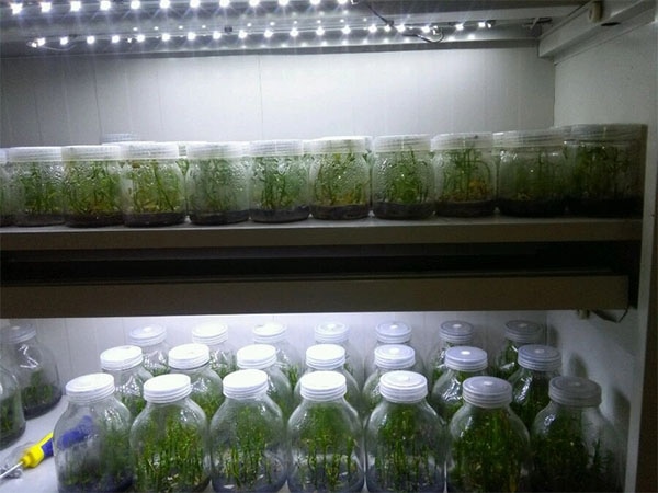 一是無根苗的試管生根 切取3cm左右無根嫩莖,轉插到1/2MS+NAA(或IBA)0.1的培養基中,經兩周即可生根。然後再進行移栽馴化,移栽初期保持高濕度條件,營養缽基質澆透水,取出生根的試管苗,洗掉附著在根部的培養基,用竹簽在基質上打一小孔,將幼苗插入基質中。然後加設小拱棚以保濕,隨著幼苗的生長,逐漸降低空氣濕度和基質含水量,轉為正常苗的管理階段。
