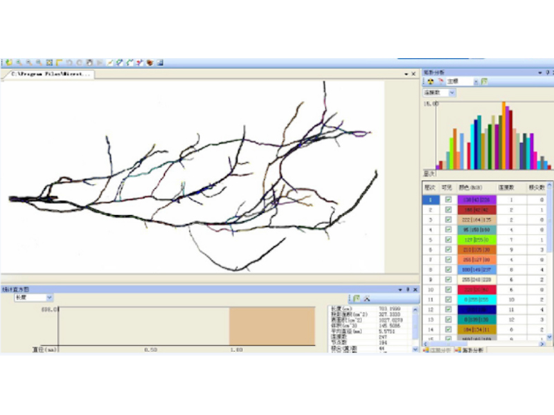 能進行根係的顏色分析,確定出根係存活數量,輸出不同顏色根係的直徑、長度、投影麵積、表麵積、體積;