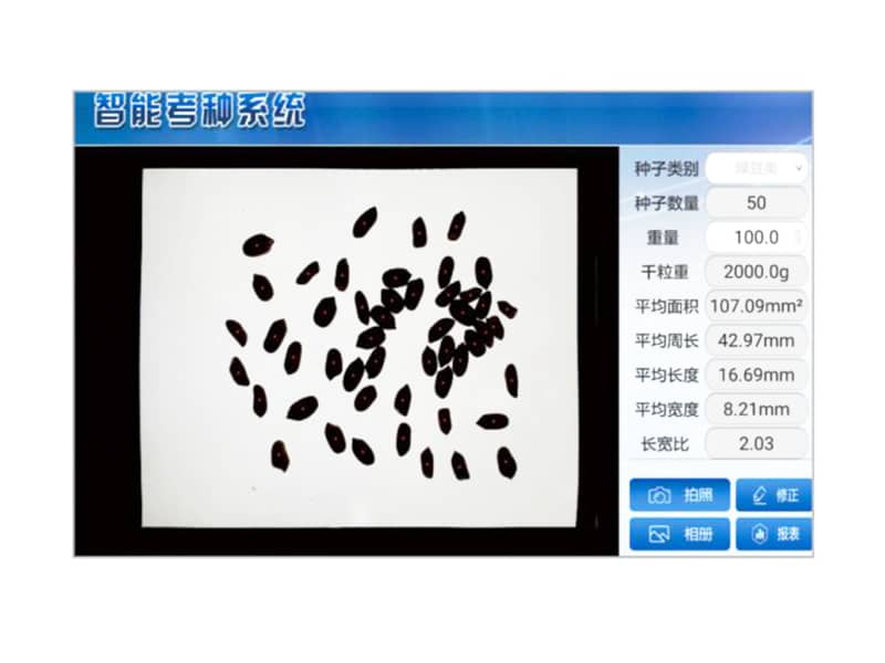2.可以直接通過拍照實現種子數量計算,手動輸入重量計算出千粒重以及平均麵積、平均周長、平均長度、平均寬度、長寬比。